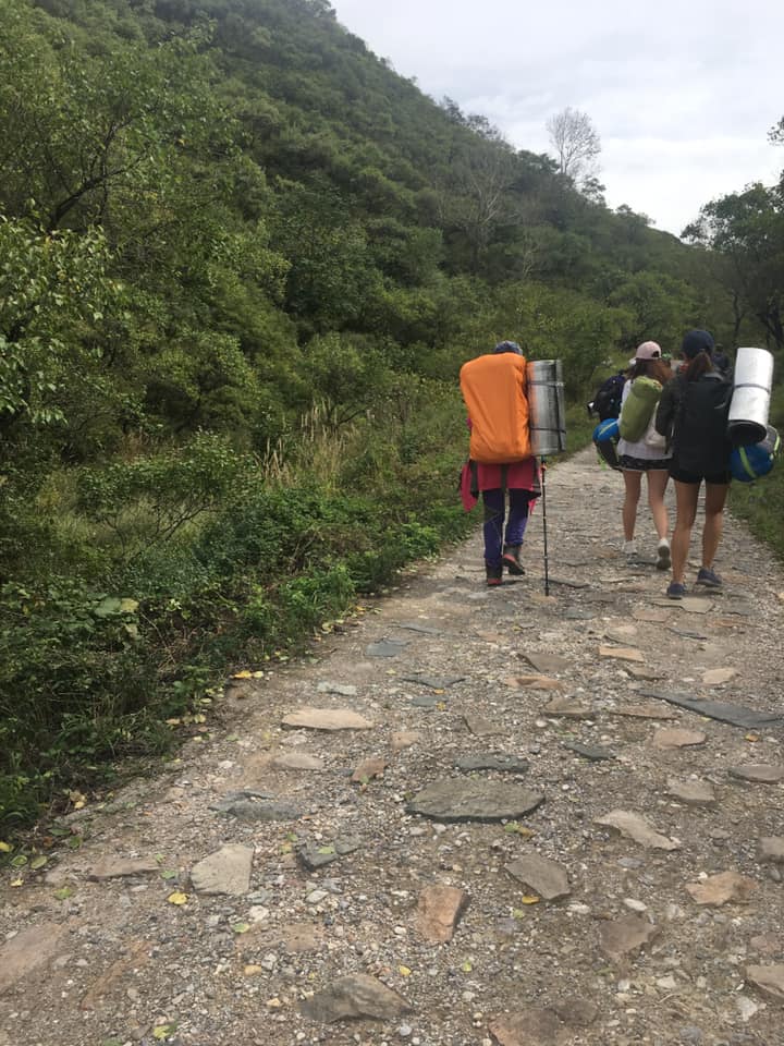As we got out, we were told we would have to grab our food and water for the next 24 hours and our camping gear (that we would carry up ourselves). Because there is no flame allowed on the wall, all of our food was stuff that could be eaten without warming it up. We all got a mixture of things, but I got bread, chicken sausage, a Twinkie-looking pastry, a mooncake, chocolate, 1.5 liters of water, and milk. Our camping gear wasn’t too heavy, but more numerous then I realized. We each had a sleeping bag, a roll-up sleeping mat, and a tent. Luckily, Korey and I were sharing so he carried it up for me! 🙂 Calvin would end up sleeping in the tent of his friend we met at the Temple of Heaven and his mom carried that up. We brought up a jacket, toilet paper, and extra underwear as advised by the group beforehand, so we were all ready to go. Most of the people went to the bathroom out in the trees before we set off but I had too much difficulty. BTW I have never gone to the bathroom in the wild before…I will explain that gem later.