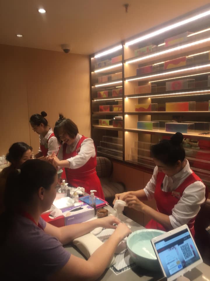 Our friend finally came back after we had been there 5 minutes. She said that this restaurant offered complimentary hand massages on the weekends (nails too on weekdays). I was in such disbelief that I signed up immediately. It was only 5 minutes or so before I was called to the front of the restaurant to receive my treatment. The technicians didn’t speak English, but were easy enough to understand. My tech kept holding up my hand to hers to compare and remarking that my hands were so white! That is a compliment here in China. She scrubbed my hands with a brown sugar exfoliant and a silky moisturizer whilst massaging my hands. The whole process took only 5 minutes, but I wasn’t expecting it so it was a real treat. She wrapped my hands in plastic gloves and said to give it 10 minutes before taking them off. I went back to my table and felt truly pampered!