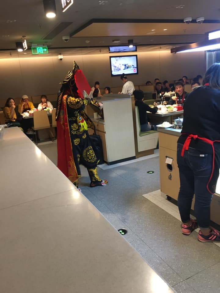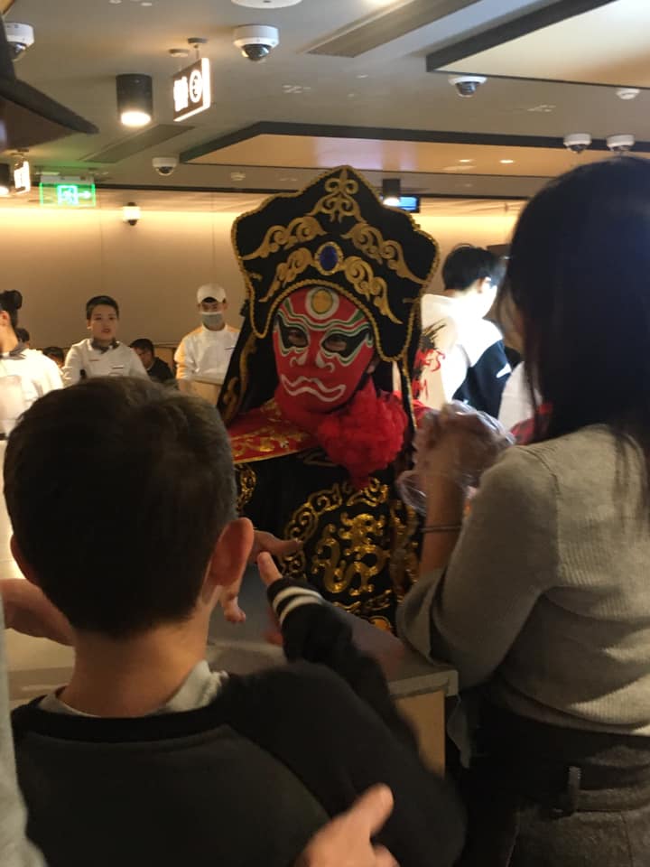 Apparently, Hai Di Lao has other performances to entertain the diners. One is a traditional Chinese dance known as the Face-Changing dance. Calvin told us that he had learned about this tradition at school, but my husband and I had never heard of it. Anyways, Hai di Lao usually performs this dance for their dinner crowd around 7 pm. But because it was our first time and we had never dined at Hai Di Lao before, the waiters told my friends that a dancer would perform for us per their request. We continued to eat as the dancer prepared and used the bathrooms. Thank god for this places’ customer service because they had western bathrooms too! The bathroom also had a full-time attendant to clean and provide things like combs, mouth wash, etc.