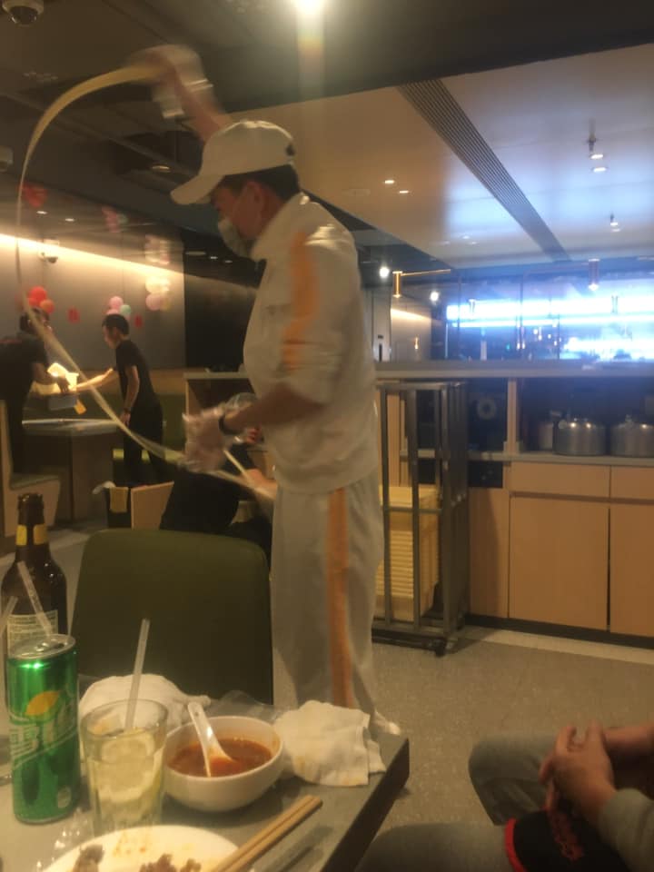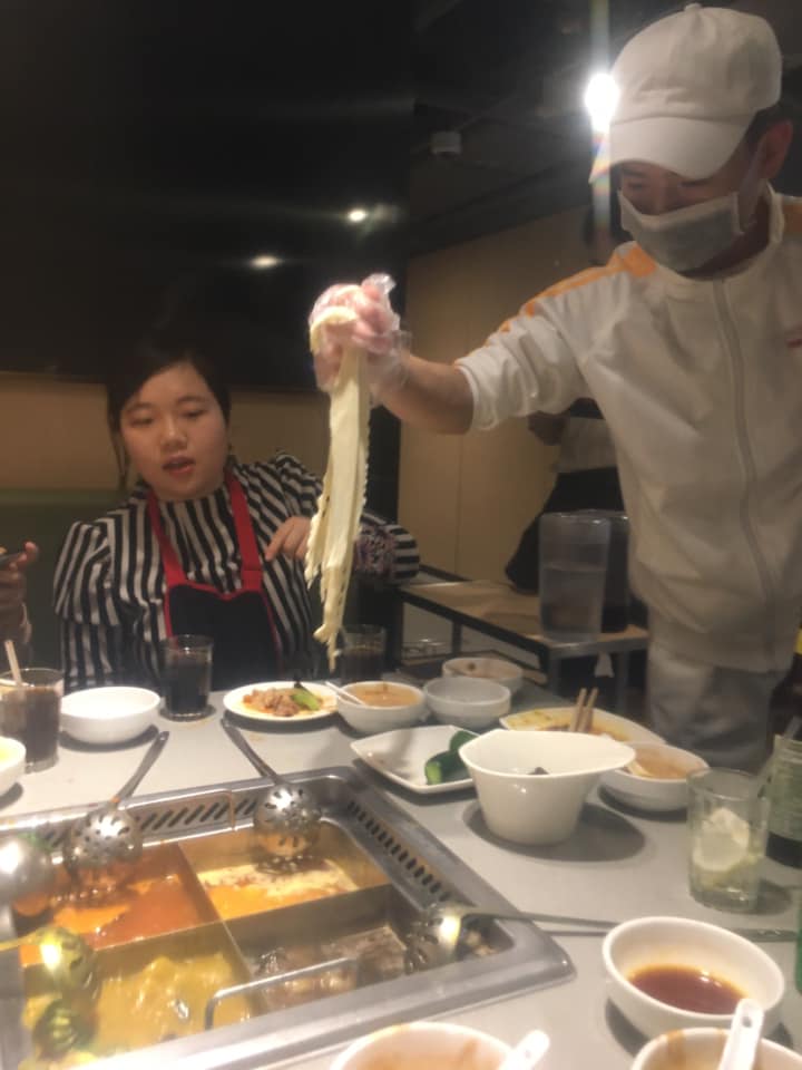 I thought we were almost done after an hour, but my friends said there was much more! They asked the waiter to perform the ‘noodle dance’. We were immediately intrigued and they said that the waiter brings out a small piece of dough to make the noodles. They stretch the noodle and does a dance to fling the dough about and make it very thin. All of this for 6 yuan (85 cents USD)! He came and performed the dance and it was even more unbelievable than described! He made the dough twirl, jump, ribbon around..and even flung it in Calvin’s face pulling back the last second, causing him to jump back! After is got the desired length and thinness, he put it into the hot pot flavors we requested to cook for a few minutes. I had the garlic one again and it was delicious!