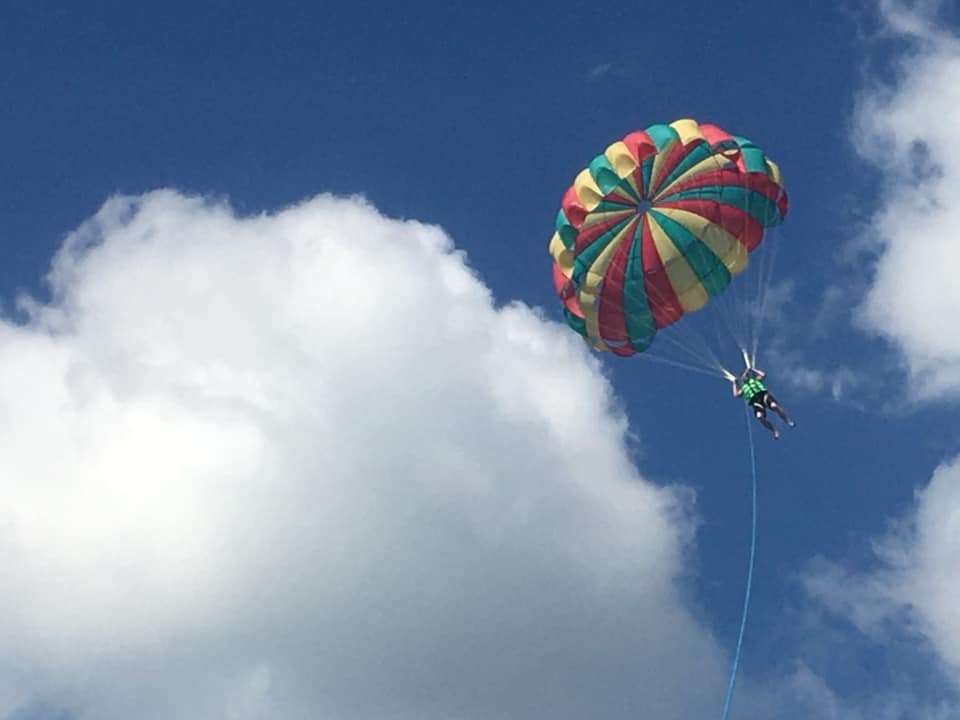 We soon said goodbye to James and separated from Maxine so they could do their own activities. My family and I walked down the boardwalk where I had a surprise waiting for them! I had seen a bunch of tourist doing it when I was in Patong earlier in the week and decided to surprise the boys with….parasailing!! We walked onto the beach and found the parasailing pros right away. Because it was both Korey and Calvin, we made a deal to have both go the long route of 3 km for 3,500 baht ($117.33) and I would get to sit in the boat to take pictures! They led us to the boat after we paid and Calvin and I got in while Korey was strapped to the parachute. They began the boat and he began to run…straight into the water. I am still not completely sure what happened but instead of going up, he went down, fully submerged in the water. But no worries, the boat picked up enough speed and he was flying through the air. I hope he could hear Calvin and I cheering him on from the boat!