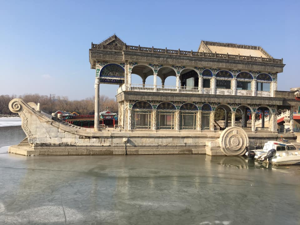 Even though it is wintertime, I was still surprised that we saw so very few people when we entered! I had been told that Beijing would be a ghost-town during the break but I wasn’t prepared for the tourist attractions to be so open! We could take all these pictures of the architecture and the lake without dozens of people doing the same thing! After we crossed the bridge, we started to see the lake in the center of the park. The lake was huge and we were informed that we were only viewing about 30% of it total size. Usually the lake has boats traveling along it but the lake was frozen, causing the sunlight to reflect off the ice beautifully! We saw the first amazing site which was called the ‘Clear and Peaceful Boat’, which was a boat made of marble and did not actually move! The base is made of stone the top is made of wood and glass. It is so big and is actually built into the lake. Our guide told us that the boat was made by the emperor using funds from the navy and became a bit of a joke in China. He joked that the navy had actually “made a boat that couldn’t move! No wonder we lost the Sino-Japanese War!”