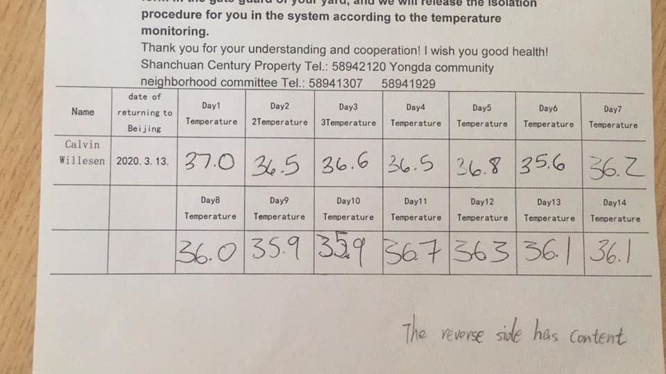 We finally returned home early one Friday morning and had to go through a health check to get into the country. The customs officials checked my passport from cover to cover to make sure I wasn’t lying about where I had been the past 2 weeks. The health check was a little strange because we were told it was really strict, but we just had to fill out a paper and walk past a thermal camera. It is possible because we were coming back from Cambodia and not a country with a high Coronavirus rate. We saw people that were returning from the high-risk countries in long lines and being sanitized in boxes. The airport staff were wearing white body suits and seemed to be on high-alert. We eventually got through and took the subway home. I was initially surprised on the ride home because the subways were packed with people. In my blog from February, you could see that the subways were all empty as the citizens were staying home and preventing the spread of the virus. Now after 2 weeks in Cambodia, the crowded cars were just a sign of life beginning to go back to normal in Beijing. I completely forgot to snap a picture of the crowds but I got one right before we got off which still shows people (still much different then pictures from the month before). We knew that we would be quarantined for 2 weeks the second we got home, so we split up. Korey and Calvin taking the luggage to head home and me heading to the grocery store to grab a few essentials. I got back 30 minutes later and could see that the boys never made it into the apartment complex. They were stopped by the community guards and were going through a painstakingly long process of explaining where we had been the past 2 weeks (through a translation app) and register with the government. It took almost an hour to get all of our information filled and submitted to the government, then they explained the rules of quarantine. We could not go out, all food and grocery deliveries would be brought up by the guards, and we had to take our temperatures everyday. Failure to comply could end up with the government taking us to a quarantine site for monitoring.