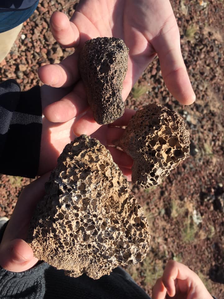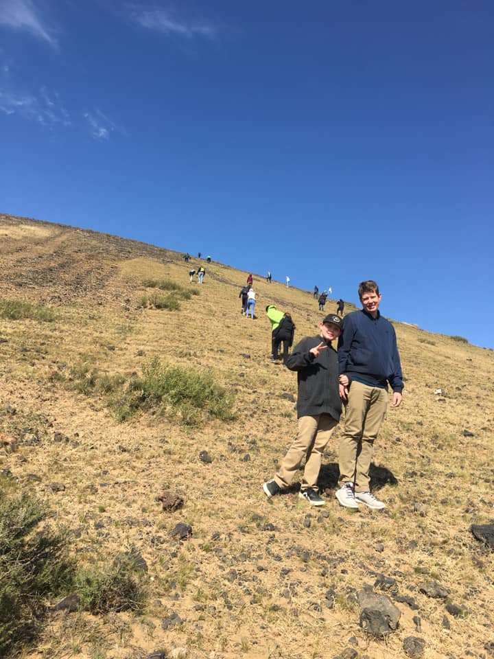 There were a few different volcanos in this area (no longer active) but we hiked up No. 5 with our group. The sides of this volcano were extremely steep! It seemed to be almost a 65 degree incline on a very unstable surface, due to all of the pumice stone and other kinds of volcanic rock. This 10,000 year old volcano was a pretty difficult climb. Everyone in our group ascended slowly and took frequent rests. The wind was really picking up as we climbed but we didn’t notice over the burning in our calves. Some in the group had to call it quits halfway up because of the gravel that would sometimes slip beneath our feet. There were no established pathways, so everyone was charting their own course to the top. I made the mistake of bringing my 20+ lb backpack with me off the bus, which made me a little unsteady. I would say it took my family nearly 20 minutes to get to the top, with other groups taking a little less time. The view from the top was great! You could see Mongolian horses in the fields some distance away and could look across the relatively flat land for miles. The wind was super bad up there though! Many were losing their hats and the windchill made our fingers extremely cold. But we were able to catch some great pictures of the view and the inside of the volcano.