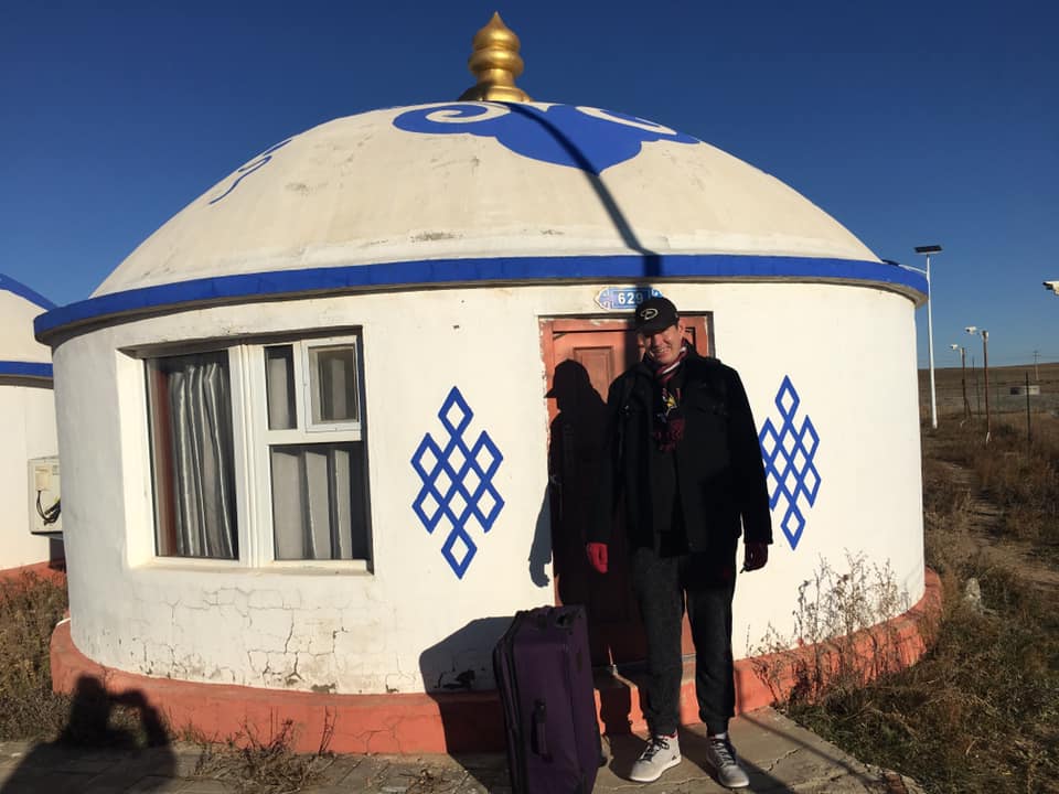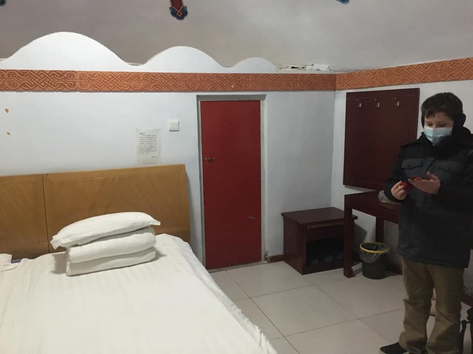 To finally leave, we need to take the sand slide down the biggest dune to get to the train back to the entrance. I was a little intimidated because I was concerned this flimsy plastic and wooden sled would flip me over with my heavy backpack! So I made Korey take it down. It was awesome and you used your hands behind you to slow down the sled so that you didn’t descend too quickly. We took the train back to the bus and started driving….and driving..and driving. I swear, we travelled over 7 hours with 2 or 3 stops to the Xiramoren Grasslands. When we finally arrived, it was after 8 pm and it was FREEZING. It was -5 degrees Celsius and we were bundled up in jackets, gloves, etc. If it wasn’t cold enough, the wind made it WAY colder. We tried to move into our 3-bed yurt, but it smelled awful. The bathroom must have been backed up because it was bad. We asked to be moved to another yurt and we got split up, Korey and I in one and Calvin in another. Thank God that they were not cloth yurts, these were actual buildings in the shape of yurts or we would have not made it through the night. The dinner was not bad, but the roast lamb they had a full ceremony about was a bit overcooked and under seasoned. After dinner, we quickly got back to our yurt to avoid the cold.