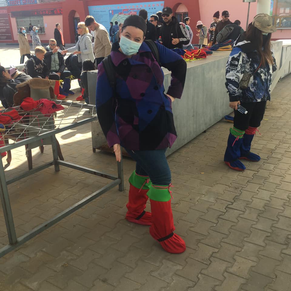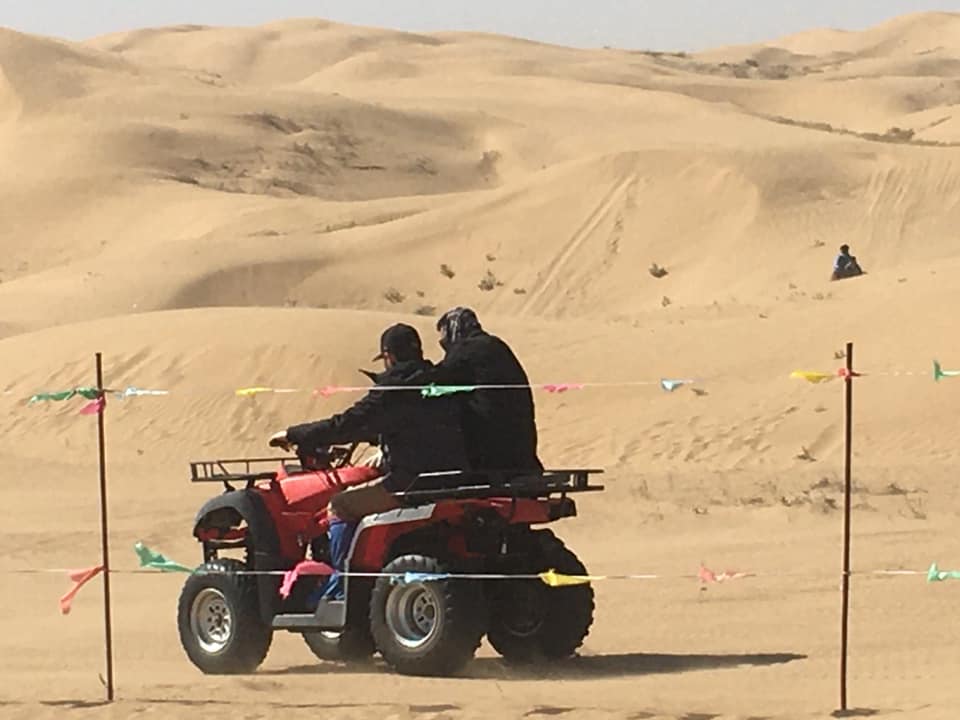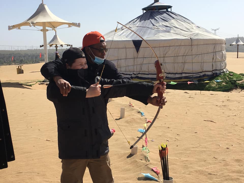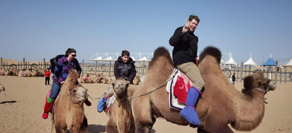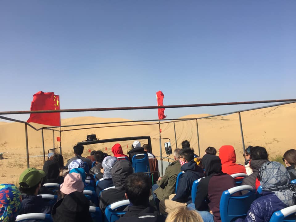 The bus ride the next morning was about 2 hours to the Kubuqi Desert. It wasn’t yet noon, but we were all in heavy jackets to protect ourselves from the mix of cold wind and sunshine. All of our days in Inner Mongolia were windy, but it felt even more so on this day because you could see the sand move along the desert landscape. This part of the desert has been sort of transformed into a desert theme park of sorts! The company here offers many desert-theme activities such as camel-riding and sand sliding. We were so ready to move around after being on the bus! The company gave us these really cool fabric stockings to wear over our shoes and jeans to prevent too much sand getting into our shoes. They really worked too, although the kids ones are a little to small for Calvin! After we entered the park, we were lead to these giant off-roading vehicles that could seat 50+ people. It felt like a ride just to get into the park! We were bouncing and swaying on the four wheel drive and you could hear everyone screaming every time we went over a dune too quickly or bumped someone too high into the air!