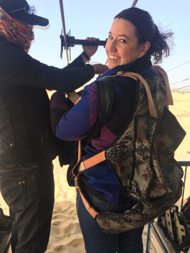 After everyone got off the first vehicle, we needed to choose what our first activity would be. We just followed the rest of the crowd up the nearest sand dune and ended up at the sand zip-lining area. I have zip lined before and so had my family, but we had never done so in a desert setting. The harnesses were different than what we had used before and I had my big, giant backpack to lug around again. I wore my backpack on my front and put on the harness, so I looked like a big ole pregnant lady about to zip line! The zip across was fairly fast and I didn’t drop my backpack! The park even had some photographers waiting at the end to snap some shots of the guests with the dunes in the background. We ending up buying the photos of Korey and Calvin because my big backpack belly was less than aesthetically pleasing. We quickly moved on to the nearest activity which was camel riding!