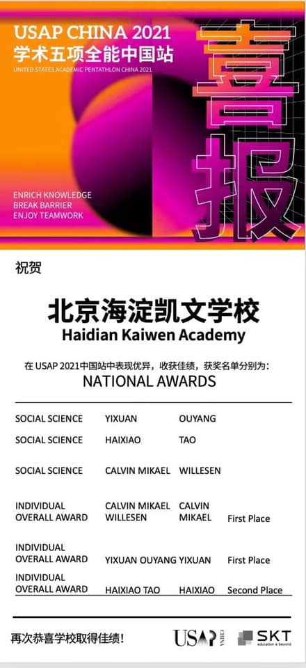 We finally went back to school and were so happy to see that Calvin had won many awards for his participation in USAP over the break! Because of COVID, the in-person competition in Hainan was cancelled and students took their exams online over the break. Calvin did well in almost all of the categories and we are so proud of him! Good job Calvin!