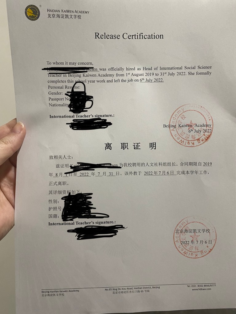 Before you leave your employer, be sure to get a work cancellation OR work release certificate from your current employer. This will help you prove to future employers of your past work experience. It also tells future Chinese employers that you completely your past school’s contract which is really important to secure another job/transfer visa to new school.